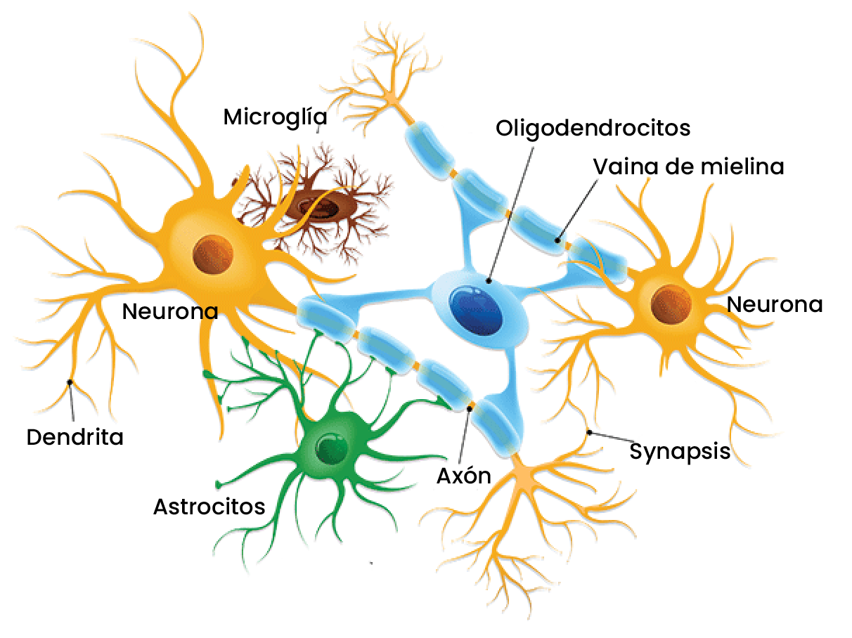 - Microglía: Las principales células inmunes del sistema nervioso central, funcionando como macrófagos para detectar y responder a lesiones o infecciones mediante fagocitosis, liberación de citoquinas y modulación de la inflamación.